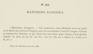 “Angora muffs. – These muffs are made with the Beard of goats from Angora, the country where these animals have been for a long time, silky and overall very white; that which is used for men’s muffs is of a great beauty. The price is 120 or 100 livres. One has them even for 4 louis or 84 livres.”