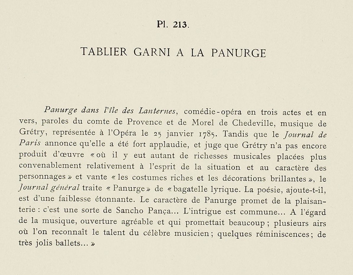 Panurge on the Isle of Lanterns,* an opera-comedy in three acts and in verse, words by the comte de Provence and Morel de Chedeville, music by Grêtry, performed at the Opera on January 25, 1785. While the Journal de Paris announces that it was strongly applauded, and judges that Grêtry had not yet produced a work “where there was as much musical richness set more properly relative to the spirit of the situation and to the personalities of the characters” and extols “the rich costumes and brilliant decorations”, the Journal general calls “Panurge” a “lyrical bagatelle. The poetry,” it adds, “is of a stunning weakness. The character of Panurge promises pleasantry: it is a sort of Sancho Panza … The plot is common … With regard to the music, the overture is agreeable and promises much; there are several airs where one recognizes the talent of the celebrated musician; some reminiscences; very pretty ballets …”