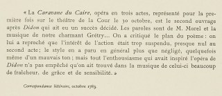 “The Caravan of Cairo, an opera in three acts, shown for the first time at the theater of the Court on October 30, is the second work after Didon which had been a decided success. The words are by M. Morel and the music by our charming Grêtry … One has criticized the plan of the poem: one has reproached him that the interest of the action was too much suspended, nearly nothing in the second act; the style seems in general more négligé, sometimes even in a bad tone: but all the enthusiasm which inspired the opera of Didon has not prevented us from finding in the music of this one much freshness, grace, and sensibility.”