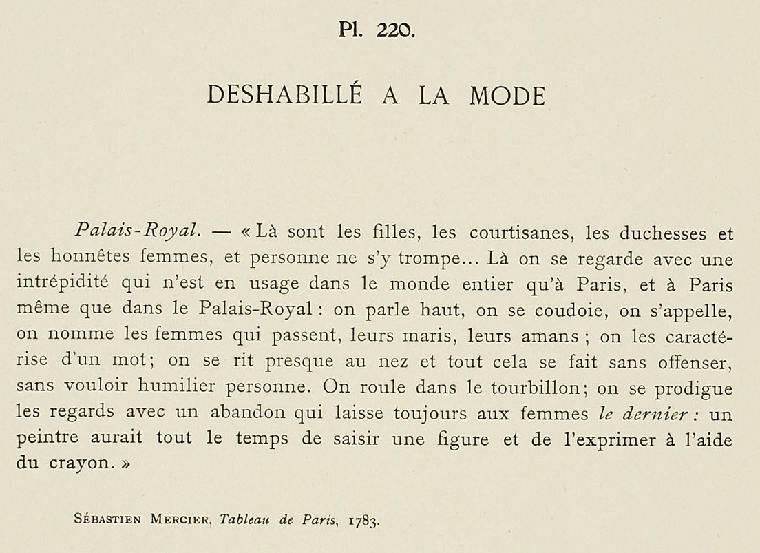 Palais Royal. – “There are the girls, the courtesans, the duchesses and honest women, and nobody is fooled … There one looks with an intrepidity which is only practiced by everyone in Paris, and in Paris even in the Palais Royal: one speaks up, one rubs elbows, one calls, one names the women who pass, their husbands, their lovers; they are characterized in a word; one almost laughs in one’s nose and all that is made without offending, without wanting to humiliate anyone. One rolls in the maelstrom; one lavishes looks with an abandon that always leaves women the latter; a painter would have all the time to capture a face and express it with the aid of a pencil.”