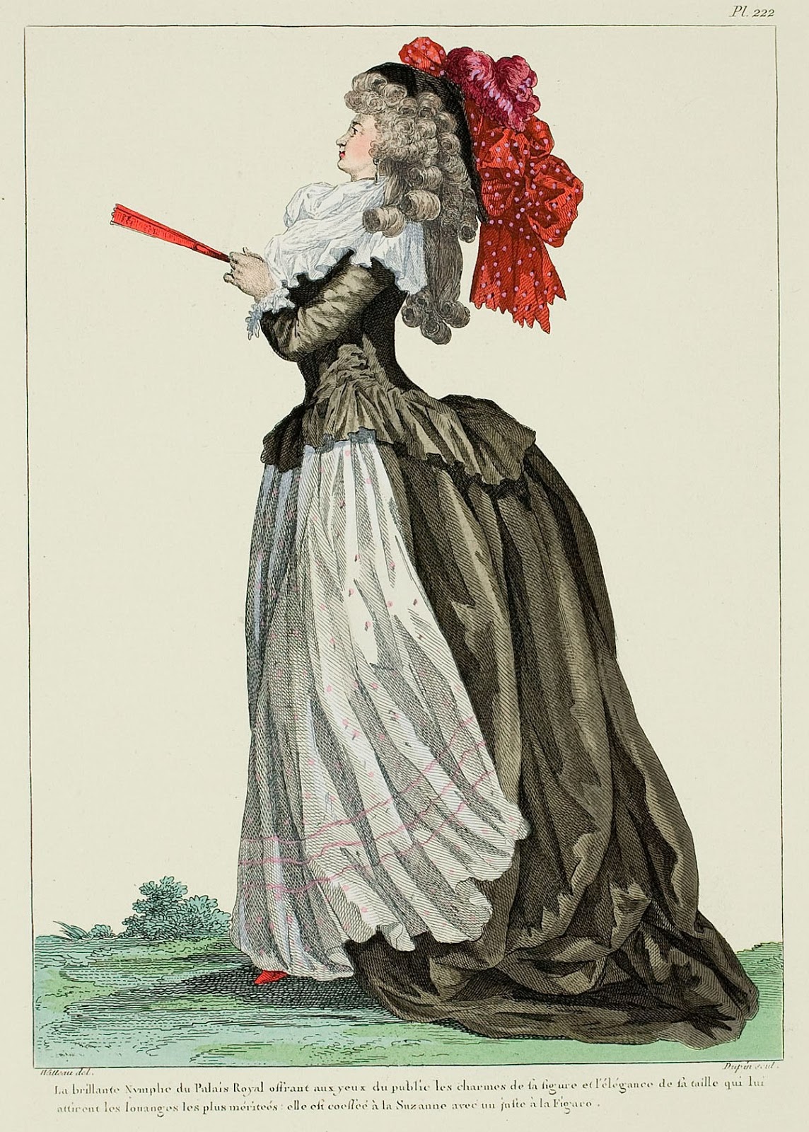 The brilliant Nymph of the Palais Royal offering to the eyes of the public the charms of her figure and the elegance of her shape which attracts to her the most merited praises: she is coiffed à la Suzanne with a juste à la Figaro. (1785)