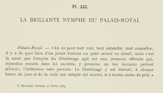 Palais Royal. – “There one can see everything, hear everything, know everything; there is plenty to do for a young man who is a little learned in detail; but that is also where the empire of debauchery is on an unbridled youth which, then widespread in society, walks there with a ton which is unknown elsewhere, indecency without passion. Debauchery is eternal there; in each hour of the day and night, its temple is open, and at all sorts of prices.”