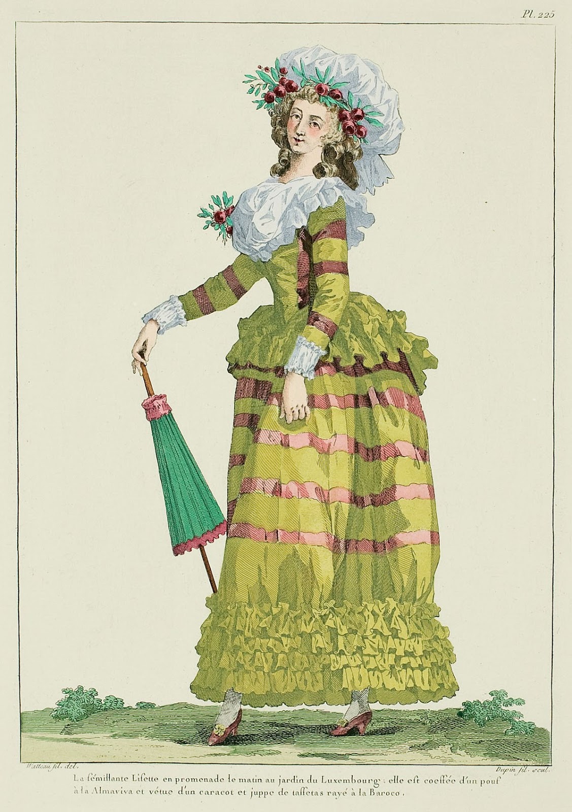 “It was useless to recommend to our young beauties walking exercise, if fashion was mixed on it. One tronchined* because coquetry found something in it. The négligé toilette is a refinement of the art of pleasing. A fine and delicate waist never fears to show itself in a caraco; the other sort is best in the gown à la polonaise and the pulled in mantelet. The shadow of an ample calash lends more piquancy to the attractions which dread the brightness of the day. A beautiful hand rounds itself on a cane which has no other use; frail ornament, that reluctantly takes these to which it becomes a necessary support.”