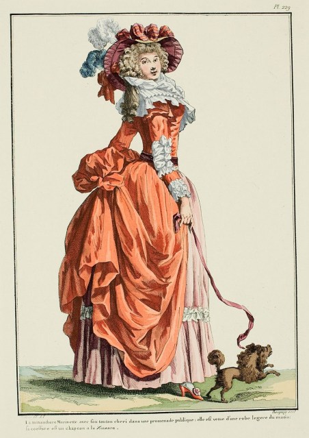 The mincing Marinette with her dear lapdog in a public promenade: she is dressed in a light morning gown; her coiffure is a hat à la Zinzara. (1786)