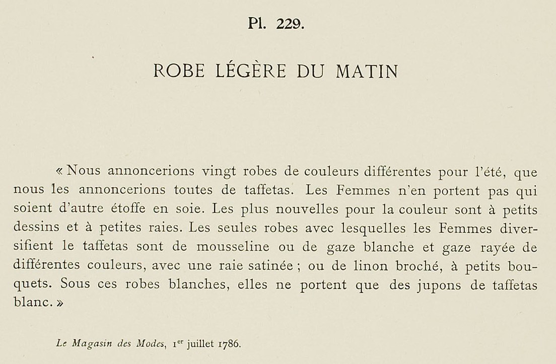 “We will announce twenty gowns of different colors for the summer, and will will announce them all in taffeta. Women do not wear those that are of another fabric than silk. The newest for color have small prints and narrow stripes. The only gowns in which Women change from taffeta are those of muslin or white gauze and gauze striped with different colors, with a satin stripe; or brocaded linen, with little bouquets. Under these white gowns, they only wear white taffeta petticoats.”