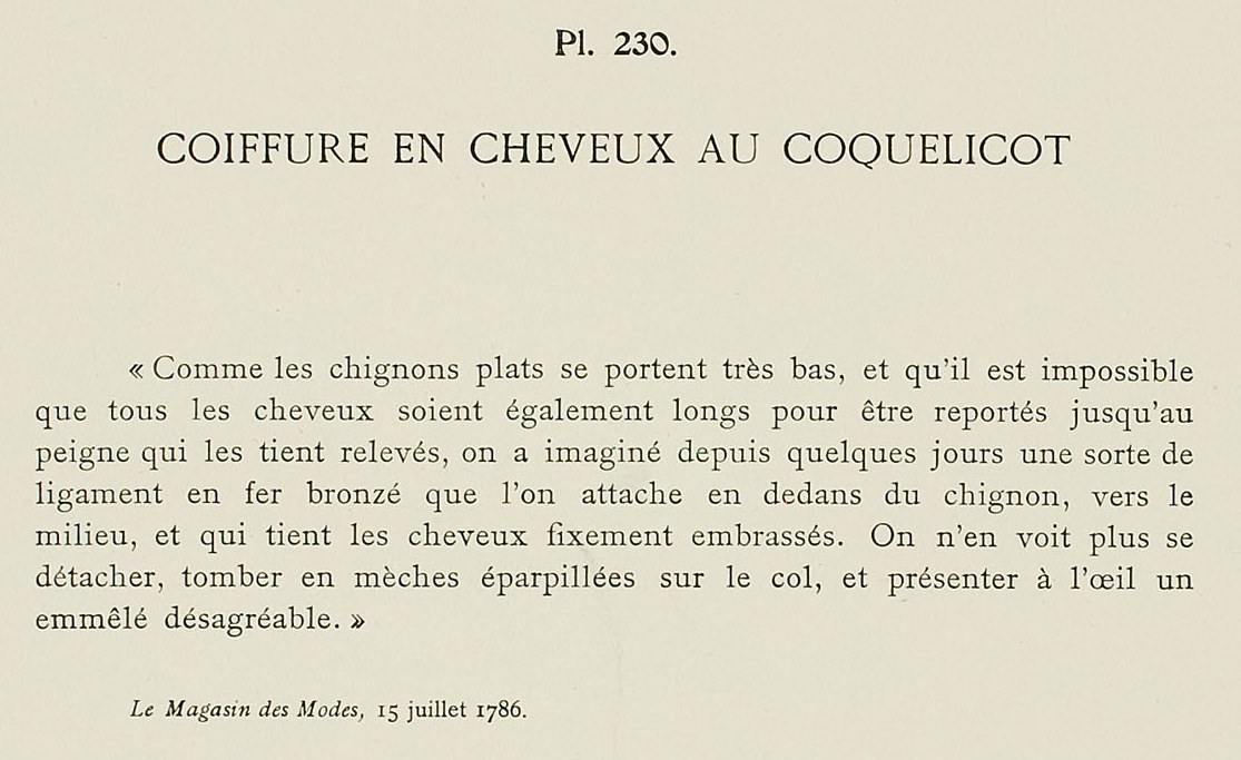 “As the flat chignons are worn very low, and it is impossible that all hair be equally long to be caught into the comb which holds them up, some time ago a sort of ligament of bronze iron was invented that is attached inside the chignon, around the middle, and which keeps the hair firmly embraced. Chignons are seen no more detached, to fall in scattered wisps on the neck, and to present to the eye a disagreeable mat.”