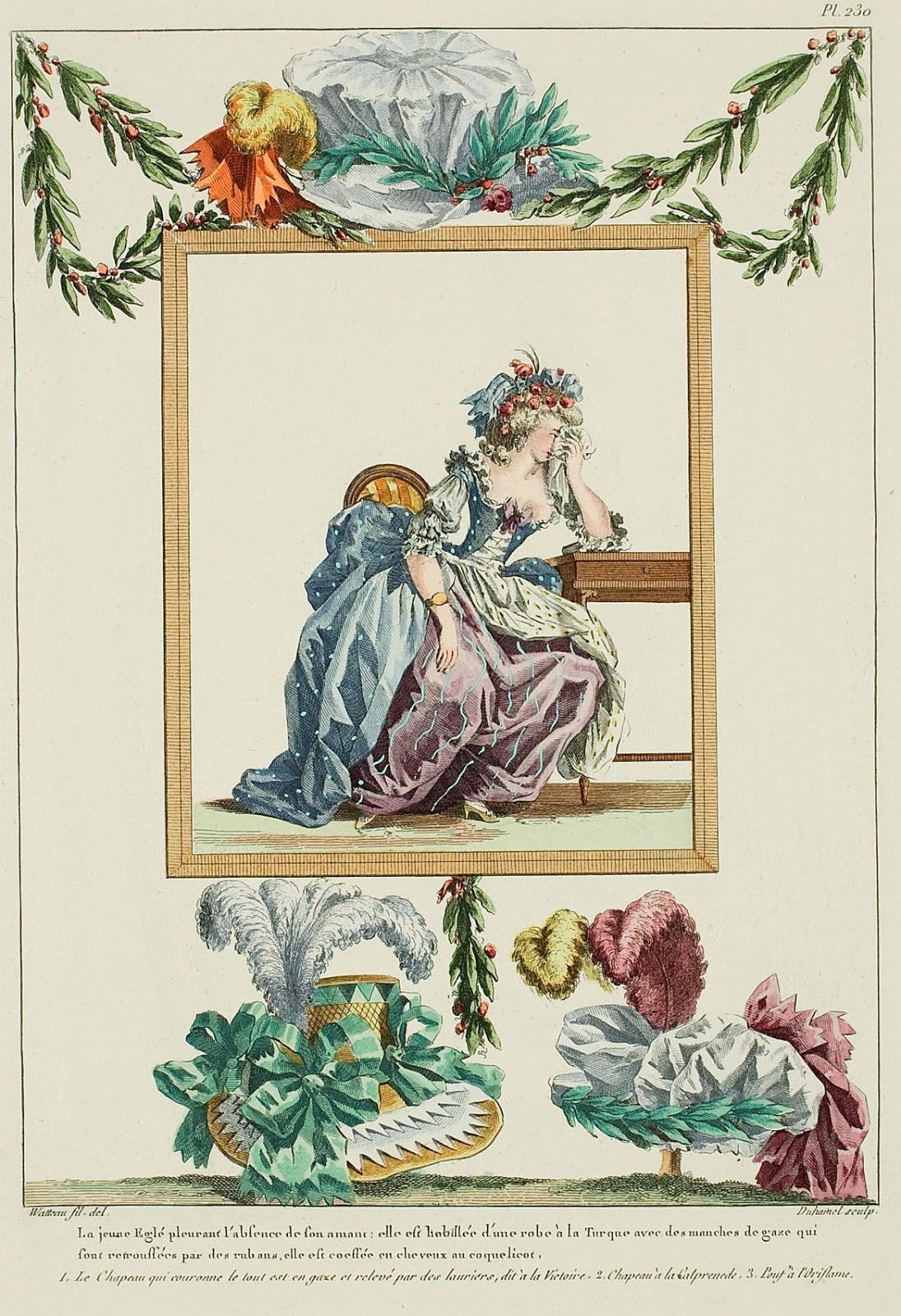 The young Eglé crying over the absence of her lover: she is dressed in a robe à la Turque* with gauze sleeves which are rétroussée with ribbons, she is coiffed en cheveux with poppies.