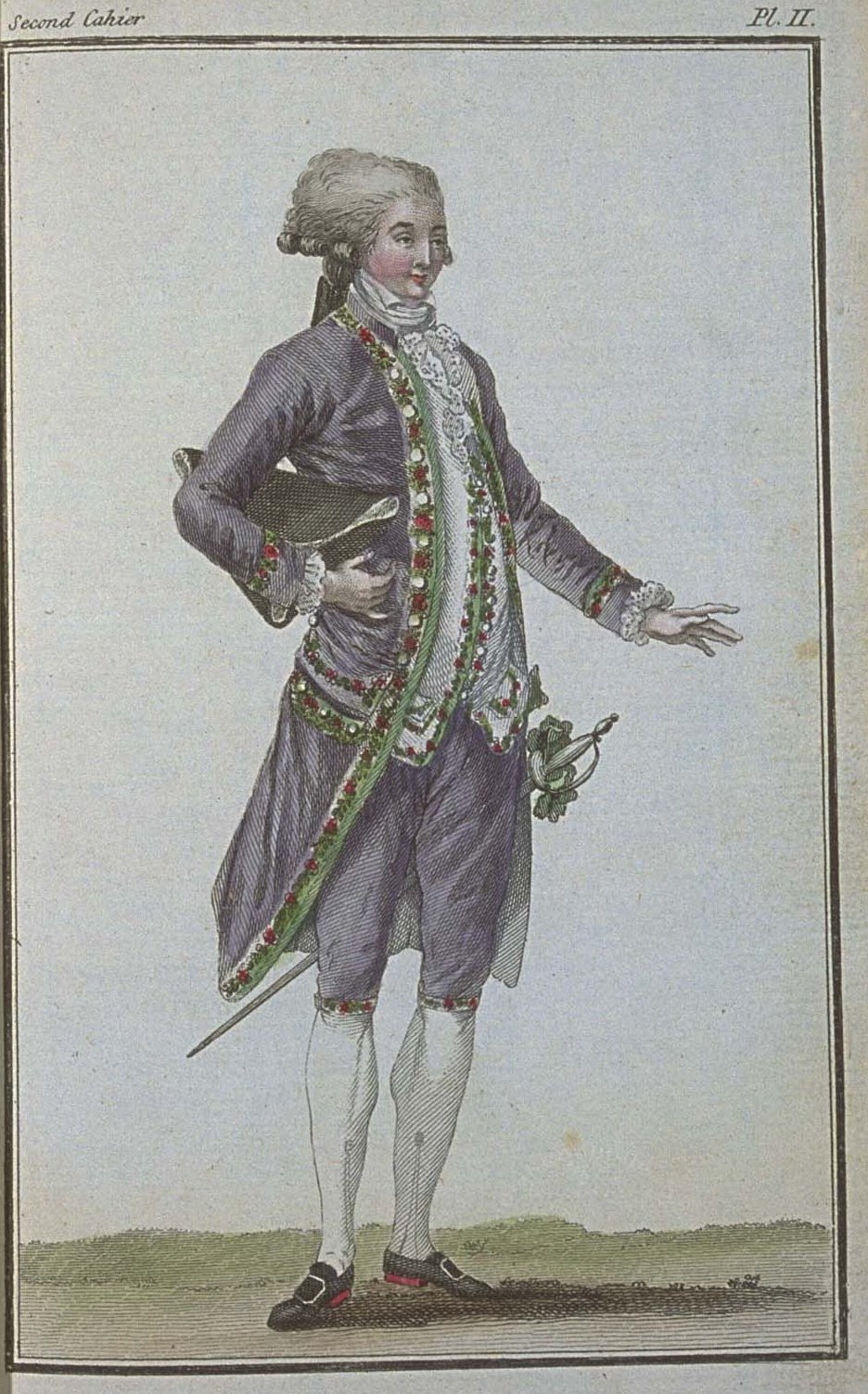 Coat of light Monsieur’s prune satin, with pink and green silk embroidery.
