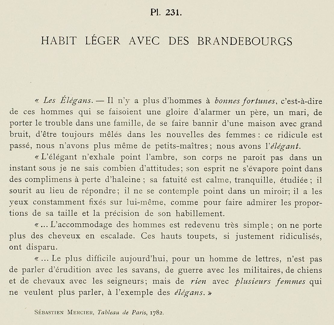 “The Elégants. – There are no more men of good fortune, that is to say those men who make it a glory to alarm a father, a husband, to carry trouble into a family, to make themselves exiled from a house with a great noise, to be always mixed in the news of women: this ridicule is passed, we have no more petits maîtres: we have the élégant.