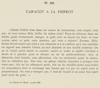 “Zulmé shined well in a muslin caraco, all simple, all plain; and do you want, Zélis, to shine with the same brilliance? No richness in her dress, no laden ornaments, taste only made them fresh; and do you want to seize this taste, this manner, which has seduced you? Listen, Zélis. Zulmé owes less of her brilliance to her dress and her coiffure than to her bearing where an amiable liberty reigns, a soft surrender and a sustained ease. One never saw her sometimes bend, sometimes stiffen and sometimes lean to the right or left, to give herself an air of the petite-maîtresse: no, her gait is forthright, without affectation, she never spites nature, she is never studied. Born with these infinite graces shared by nearly all of your sex, she never offends them, she never smothers them under all the affectations that a woman who doesn’t have a just and proportional mind overburdens herself with. Make no mistake, it takes a mind and a rather good one to have taste …”