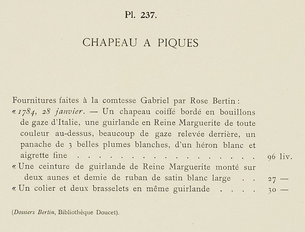 1784, January 28. – A coiffed hat edged with bouillons of Italian gauze, a garland en Reine Marguerite of all colors on top, a lot of gauze pulled up behind, a panache of 3 beautiful white plumes, of one white heron and a fine aigrette. … 96 livres.