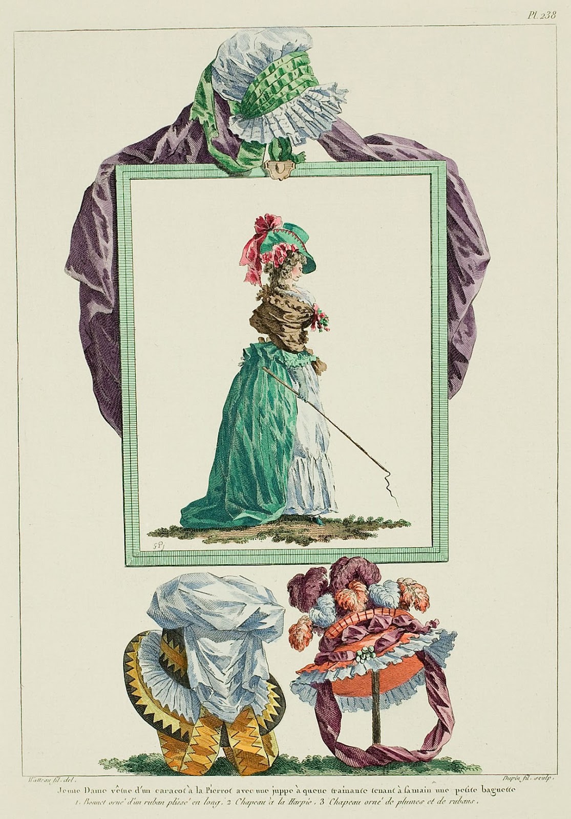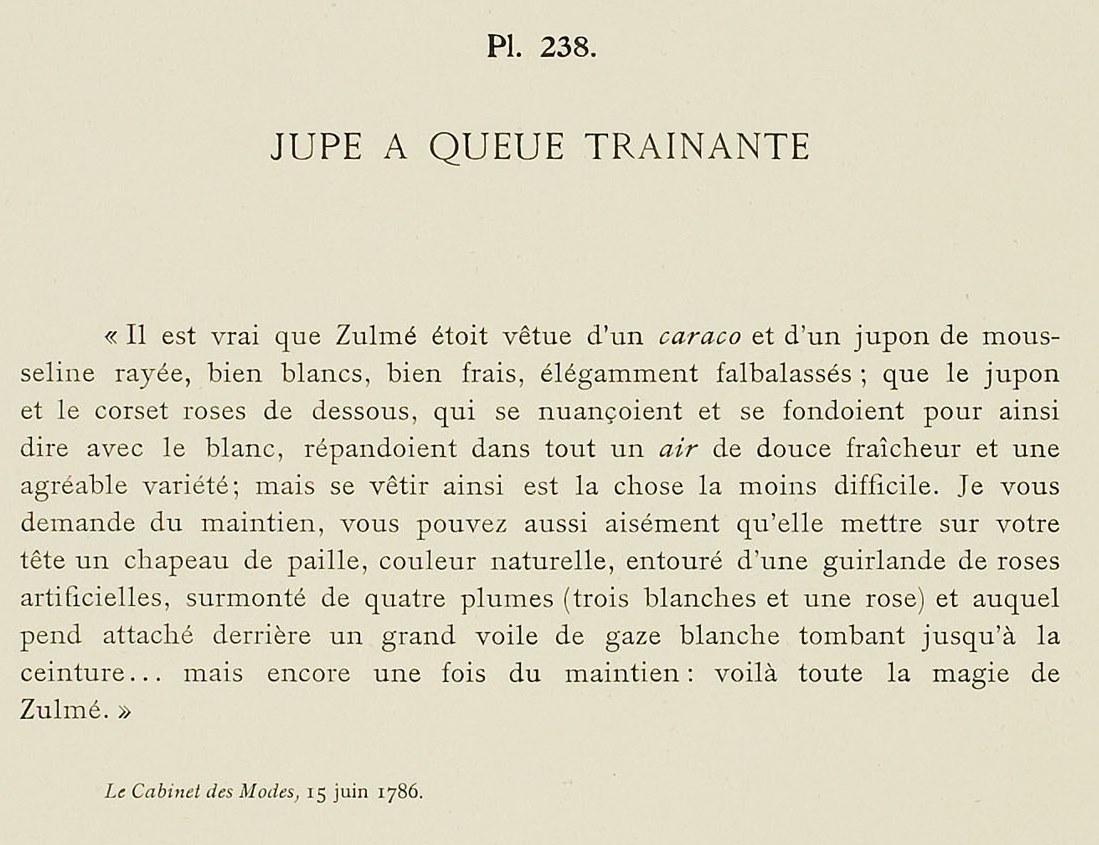 “It is true that Zulmé was dressed in a caraco and a petticoat of striped muslin, very white, very fresh, elegantly flounced; the petticoat and the pink corset beneath, which was shaded by and made a base, so to speak, for the white, spread overall an air of sweet freshness and an agreeable variety: but to be dressed thus is the least difficult thing. I ask you for the maintenance, you can as easily as she put on your head a straw hat, in the natural color, wrapped with a garland or artificial roses, surmounted by four plumes (three white and one pink) and to which hangs, attached behind, a large veil of white gauze falling to the waist … but still one time of the maintenance:** there is all the magic of Zulmé.”