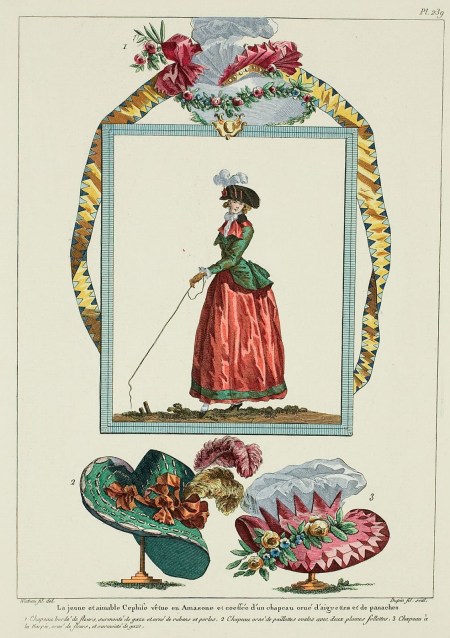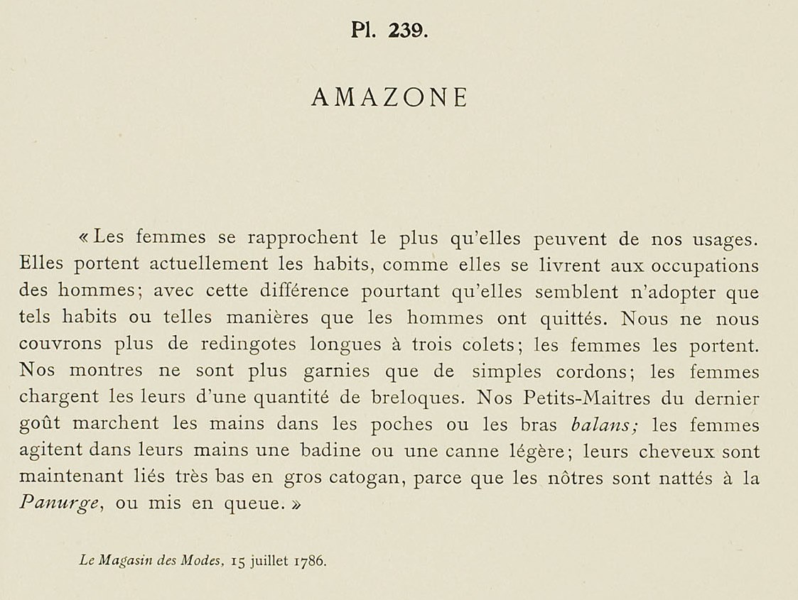 “Women come closer as much as they can to our practices. They actually wear suits, as they engage in male occupations; with the difference, however, that they seem only to adopt such suits and such manners that men have abandoned. We no longer cover ourselves with long, three-collared redingotes; women wear them. Our watches are now trimmed with simple cords; women burden their with a quantity of trinkets. Our Petit-Maîtres of the latest taste work their hands into their pockets or their arms dangling; women play with a toy or a light cane in their hands; their hair is now tied very low in a large cadogan, because ours is braided à la Panurge, or put in a queue.”