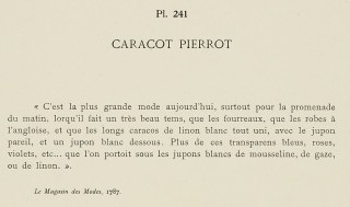 “It is the greatest fashion today, overall for the morning promenade, when it is the best weather, to wear the fourreaux, the robes à l’anglaise, and the long caracos of solid white linen, with a matching petticoat and a white petticoat on top.* Besides these blue, pink, violet, etc. transparens that are worn under the white muslin, gauze, or linen petticoats.”