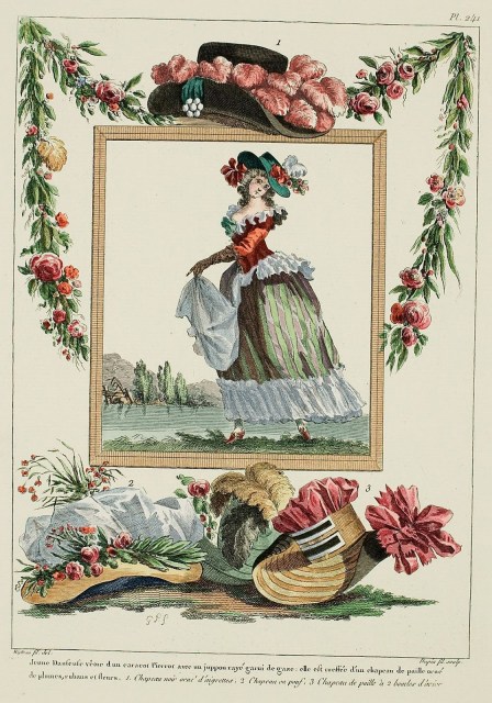 Young Dancer dressed in a Pierrot caraco with a striped petticoat trimmed with gauze: she is coiffed with a straw hat trimmed with plumes, ribbons and flowers. 1. Black hat trimmed with aigrettes. 2. Hat en pouf. 3. Straw hat with 2 steel buckles. (1786)
