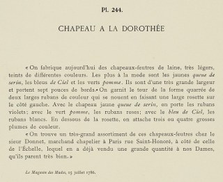 “Today felt hats are made of wool, very light, with tints of different colors. The most fashionable are the canary’s tail yellows, the sky blues, and the apple greens. They are of a great size and have brims seven inches wide. They are trimmed around the squared crown with two wide colored ribbons which are tied to make a large rosette on the left side. With the canary’s tail yellow hat, violet ribbons are worn; with the apple green, pink ribbons; with the sky blue, white ribbons. Under the rosette, three or four large colored plumes are attached.