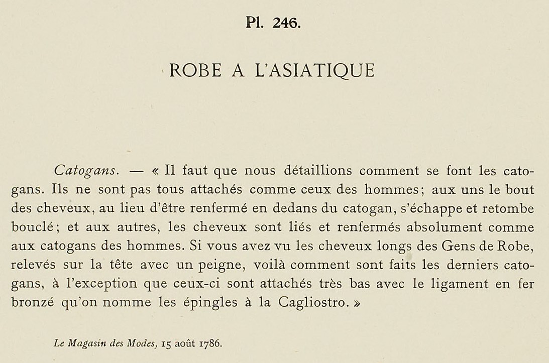 Cadogans. – “It is necessary that we detail how cadogans are made. They are not all tied like those of men; at one end of the hair, instead of being contained within the cadogan, it escapes and falls in curls; and at the other, the hair is tied and contained absolutely like men’s cadogans. If you have seen the long hair of the People of the Robe,* pulled up on the head with a comb, that is how the newer cadogans are made, with the exception of those that are caught at the bottom with a bronzed iron ligament that is called a pin à la Cagliostro.**
