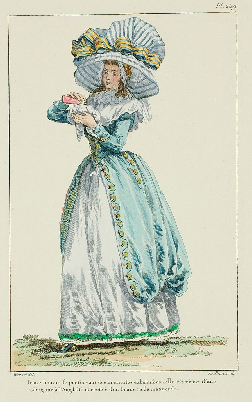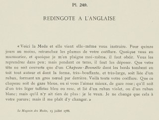 “Here is Fashion and she comes herself to instruct us. For at least fifteen days, retrench the plumes and your coiffure. While you murmur about it, and while I myself complain about it, it is necessary to obey. You will take them back again in a little while; but during this time, they must be deposed. Your head may only be covered with a Chapeau-Bonnette whose brim falls rooflike all around and whose crown, very puffed and very large, is tied with a ribbon, forming a large bow in the back. There is your whole coiffure. This hat may be of blue gauze, or if you like it better, pink gauze; it may be of a very light blue or pink taffeta, and tied with a violet ribbon, or a white ribbon; but there may be nothing more: I want it. I only change what is in your parure; but it pleases me to change it.”