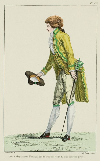 Knight’s Costume. – “Coat, vest, and breeches of a silk stuff appropriate to the season: on the sword, a cabbage bow which prevents the hilt from being found; very long curls, and overall extremely large, because they mingle better; the hair very enlarged, very crimped, the toupet strongly in front, and the sides very large; so that there is only the cap to put on to make a woman’s coiffure.”