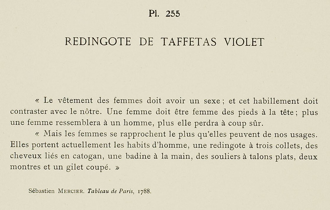 “Women’s clothing must have a sex; and this dress must contrast with ours. A woman must be woman from head to foot: the more a woman resembles a man, the more she surely loses.