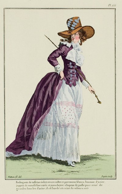 Redingote of violet taffeta, revers, collar, and cuffs white, steel buttons, striped and spotted muslin petticoat: puce straw hat trimmed with large steel buckles: it is edged and belted with black velvet. (1787)