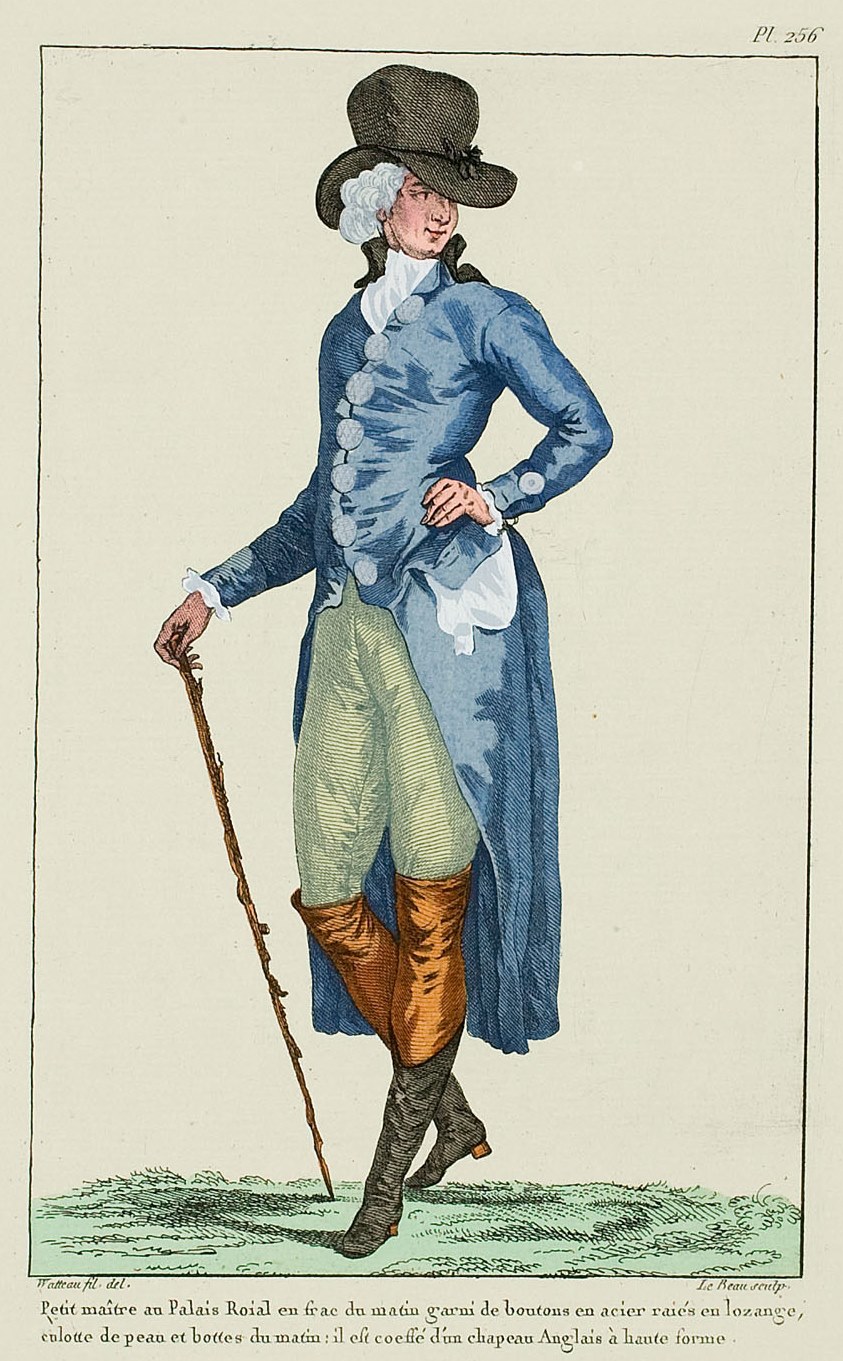 Petit Maître at the Palais Royal in a morning frock coat trimmed with striped, lozenge-shaped steel buttons, leather breeches and morning boots: he is coiffed with an English hat with a high crown. (1787)