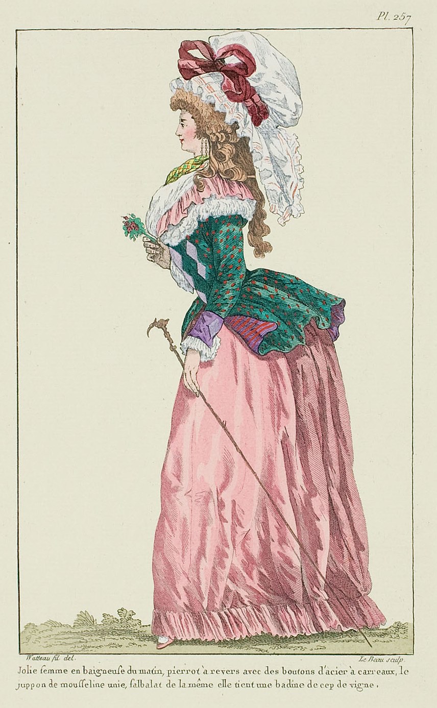 Costume of the Marquise. – “Pierrot and petticoat of embroidered linen, trimmed with lace, pink underpetticoat, kerchief trimmed with seven collars per side; hat à la caravanne, two and a half feet high and five feet in circumference; the hair en Conseiller, shaded by two drapes of three ells of Italian gauze, hanging behind the hat, pink shoes, the soles of which are not 7/12″ wide: on the face, 3/24″ of white and 2/12″ (minus an eighth), of red;* on the ears, spangled rings six inches long; the eyelashes, brows, lips, veins, etc. painted following art; the whitest and best-made teeth that one could find.”
