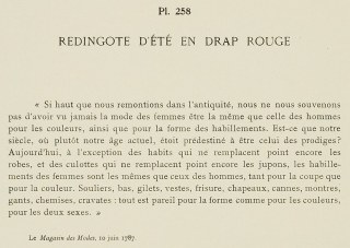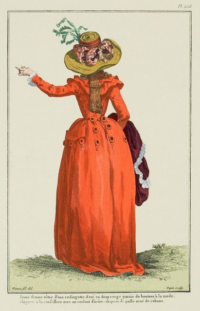 “As far as we’ve looked into antiquity, we cannot remember having ever seen women’s fashion being the same as men’s in color, as well as the form of their dress. Is it that our century, or rather our actual era, was predestined to be one of miracles? Today, except the coats which still do not replace gowns, and the breeches which still do not replace petticoats, women’s dress is the same as men’s, both in cutting and color. Shoes, stockings, gilets, vests, frisure, hats, canes, watches, gloves, shirts, cravats: everything matches in shape as in colors for the two sexes.”