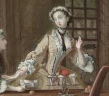 Lady Davers, restraining Pamela with a nasty look on her face, is dressed in a more markedly wealthy way. For one thing, she is wearing a sacque, which at that time was just coming into fashion in England. The sacque’s cuffs and robings are made out of a heavily brocaded fabric that looks like it might even use metallic threads. Her cap is very much like Pamela’s, as are her ruffles and tucker, but her hair is powdered and she appears to have a fur tippet wrapped around her neck.