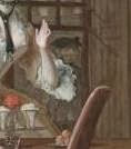 Mrs. Jewkes has been somewhat redeemed in the text at this point, and treats Pamela with the respect she deserves. When Lady Davers asks for a table and chairs to be brought in so she and Jackey can eat, Mrs. Jewkes makes sure a third chair is added for Pamela (although Lady Davers refuses to allow her to be seated, due to her determination that Pamela is her brother’s mistress). Perhaps relating to her change of moral position, Mrs. Jewkes is also dressed more respectably, in a black gown with a kerchief covering the stomacher, and a long white apron. Her cap was previously usually worn with the “ears” pinned up, but now they are tied firmly under her chin.