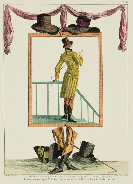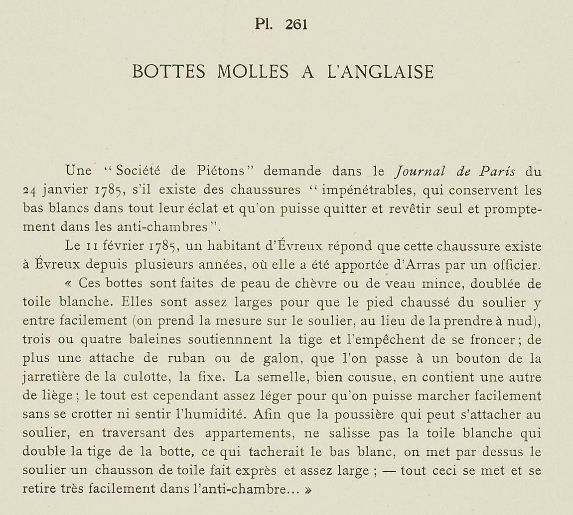 “These boots are made of goat leather or thin calf, lined with white linen. They are rather wide so that the shod foot can be put in easily (one takes the measure over the shoe, rather than without it), three or four whalebones support the shaft and prevent it from wrinkling; further, one attaches a ribbon or braid which is passed from a button to the garter of the breeches and fixes it. The sole, well-sewn, contains another of cork; the whole is however rather light so that one can walk easily without muddying oneself or feeling the humidity. So that the dust which can cling to the shoe, in crossing apartments, does not dirty the white linen which lines the shaft of the boot, which stained white stockings, one puts on over the shoe a linen slipper made expressly and rather large; – all this is worn and is taken off easily in the antechamber …”