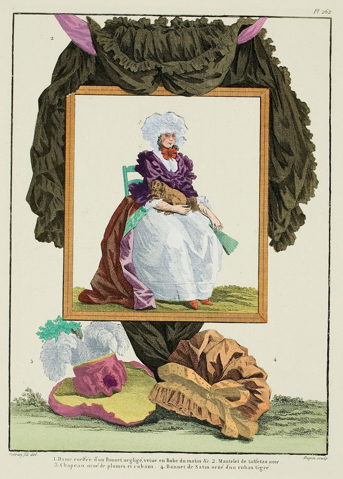 1. Lady coiffed with a négligé Cap, dressed in a morning Gown. 2. Mantelet of black taffeta. 3. Hat trimmed with plumes and ribbons. 4. Satin Cap trimmed with a streaked ribbon. (1787)