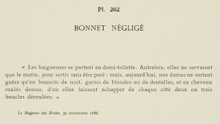 “Baigneuses are worn in the demi-toilette. Formerly, they only served for the morning, to go out without being fully dressed; but, today, our ladies hardly go out in night caps, trimmed with blonde lace or bobbin lace, and in hair rolled above, from which escapes from each side two or three unrolled curls.”