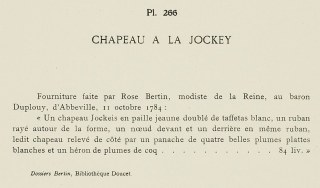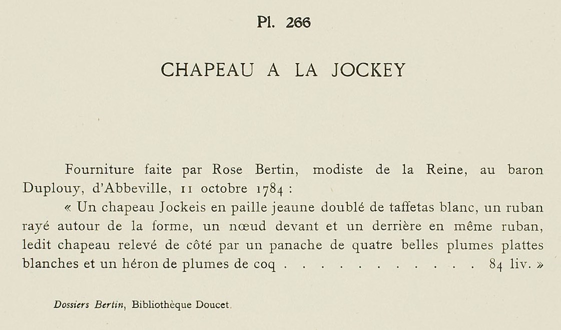 “A Jockey hat in yellow straw lined with white taffeta, a striped ribbon around the crown, a bow in front and in back in the same ribbon, said hat pulled up at the side with a panache of four beautiful flat white plumes and an héron of rooster plumes. … 84 livres.”