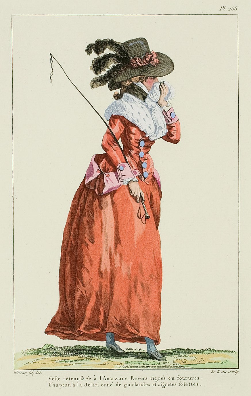 Vest retroussée à l’Amazone, Revers of streaked fur. Hat à la Jokei trimmed with garlands and follette aigrettes. (1787)