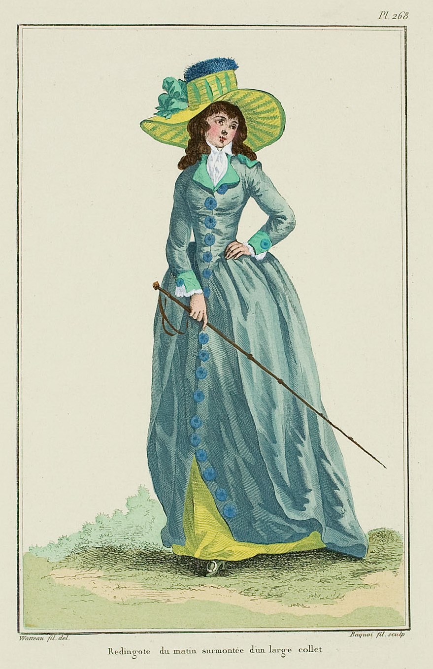 2. Dear Cassidy,Found the sources! Fanny is, I think, speaking of wearing a redingote, don't you think? The timing is right — the late 1780s. Elsewhere Fanny speaks of wearing a white dimity greatcoat. (http://books.google.com/books?id=NRgd-xCIzuUC&pg=PA82&lpg=PA82&dq=fanny+burney+diary+greatcoat&source=bl&ots=du6ilT176M&sig=MepUQRlJO5dyeXh7Ec_97y4SqK4&hl=en&sa=X&ei=_rJlUoy2OMfG4AOnkIGoDw&ved=0CCwQ6AEwAA#v=onepage&q=fanny%20burney%20diary%20greatcoat&f=false). I found these online. The words are in my volumes, but I have the 1840s version, in print. There are so many versions of the diaries :}Here Fanny discusses the queen and her clothing preferences:”There are few points I have observed with more pleasure in her than all that concerns the office which brings me to her in this private and confidential manner. All that breaks from her, in our teie-cttites^ upon the subject of dress, is both edifying and amiable. She equips herself for the drawing-room with all the attention in her power; she neglects nothing that she thinks becoming to her appearance upon those occasions, and is sensibly conscious that her high station makes her attire in public a matter of business. As such, she submits to it without murmuring; but a yet stronger consciousness of the real futility of such mere outward grandeur bursts from her, involuntarily, the moment the sacrifice is paid, and she can never refuse herself the satisfaction of expressing her contentment to put on a quiet undress. The great coats are so highly in her favour, from the quickness with which they enable her to finish her toilette, that she sings their praise with fresh warmth every time she is allowed to wear them, archly saying to me, with most expressive eyes, ” If I could write ” if I could but write 1 ” how I would compose upon a great coat! I wish I were a poetess, that I might make a song upon it ” I do think something very pretty might be said about it.'These hints she has given me continually; but the Muse was not so kind as ever to make me think of the matter again when out of her sight ” till, at last, she one day, in putting on this favourite dress, half gravely, said, ” I really take it a little ill you won't write something upon these great coats! ' I only laughed, yet, when I left her, I scribbled a few stanzas, copied them very fairly, and took them, as soon as they were finished, into her room; and there kept them safely in my pocket-book, for I knew not how to produce them, and she, by odd accident, forbore from that time to ask for them, though her repeated suggestion had, at last, conquered my literary indolence.!”Citation: Burney, Fanny. (2013). pp. 424-5. The Diary and Letters of Madame d'Arblay (Frances Burney), 1890 (Vol. 1). Hong Kong: Forgotten Books. (Original work published 1890)Very best,Natalie