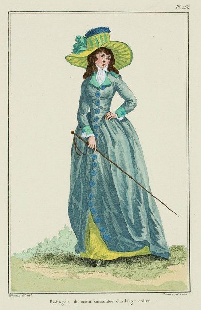 1. Dear Cassidy,I have to go and look it up for you, but seem to recall that Fanny Burney and Queen Charlotte wore what we term redingotes for dress in private…but Fanny used another name for them. She loved them for their ease of wearing.Thanks,Natalie