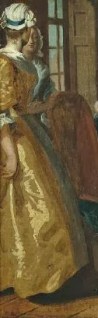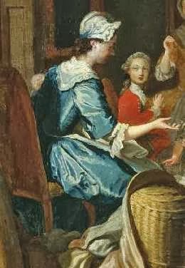 The nursery-maid in the back, sewing linen for the children, may also be wearing gold taffeta. She also has an apron, a kerchief, and a cap that is fastened under her chin. In some ways, this maid brings the story in the paintings around full circle, to Pamela’s original position in Mr. B’s mother’s household.