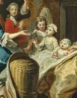 In the last painting in the series, Pamela is once again dressed in light blue, a color which has strong associations with the Madonna – appropriate for the scene. Her sleeves are wide, with no cuffs, and she may not be wearing a hoop. Her cap is of the more concealing type, but the ears are pinned up; her kerchief is translucent, and has a ruffle around the edge. Only the top of Jemmy’s head can be seen.