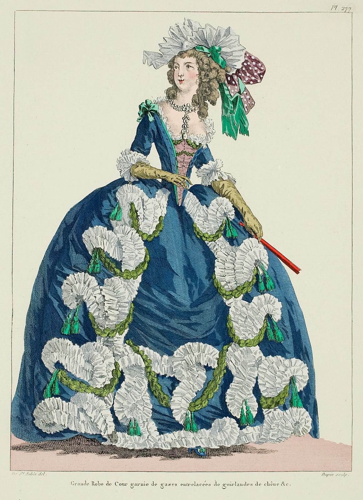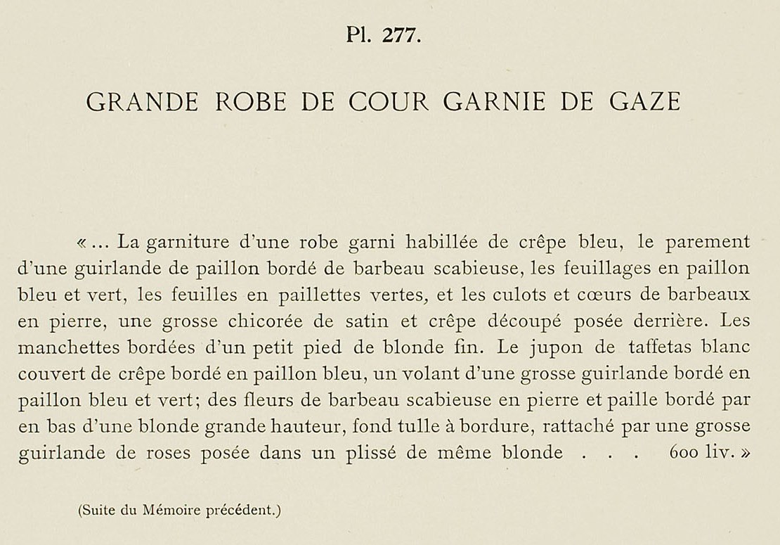 “… The trimming of a trimmed gown dressed with blue crêpe, the parement of a garland of sequins edged with cornflowers, the petals in blue and green sequins, the leaves in green sequins, and the bases and hearts in stones, a large satin and pinked crêpe chicory positioned behind. The manchettes bordered with a petit pied of fine blonde. The petticoat of white taffeta covered with crêpe edged with blue sequins, a volant of a large garland edged with blue and green sequins; cornflowers in stones and sequins edged on the bottom with a very high blonde lace, a tulle ground with a border, held up with a large garland of roses positioned on a pleated frill of the same blonde. … 600 livres.”