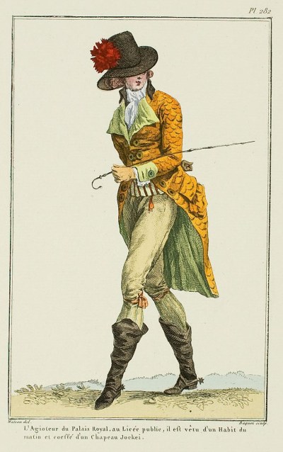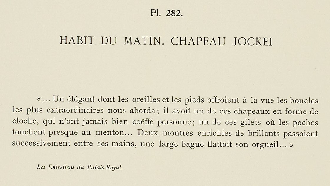 “… An élégant whose ears and feet offer to view the most extraordinary buckles, we approached; he had one of these hats in the form of a bell, which have never coiffed anyone well; one of these gilets where the pockets almost touch the chin … Two watches enriched with brilliants passed successively between his hands, a large ring flatters his pride …”
