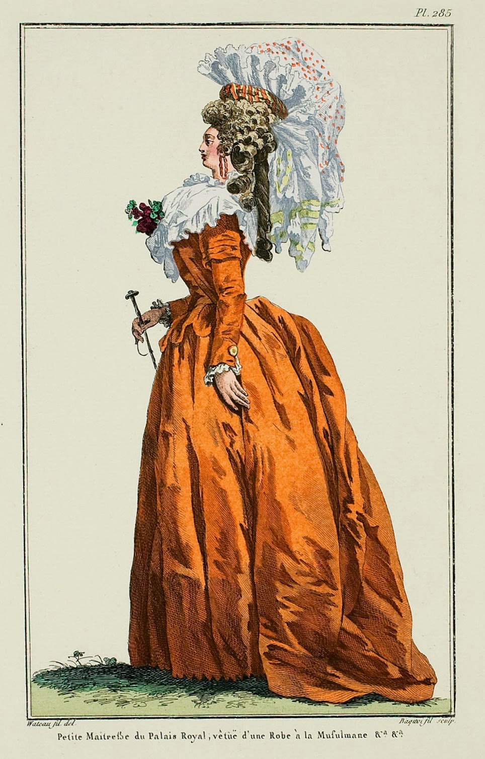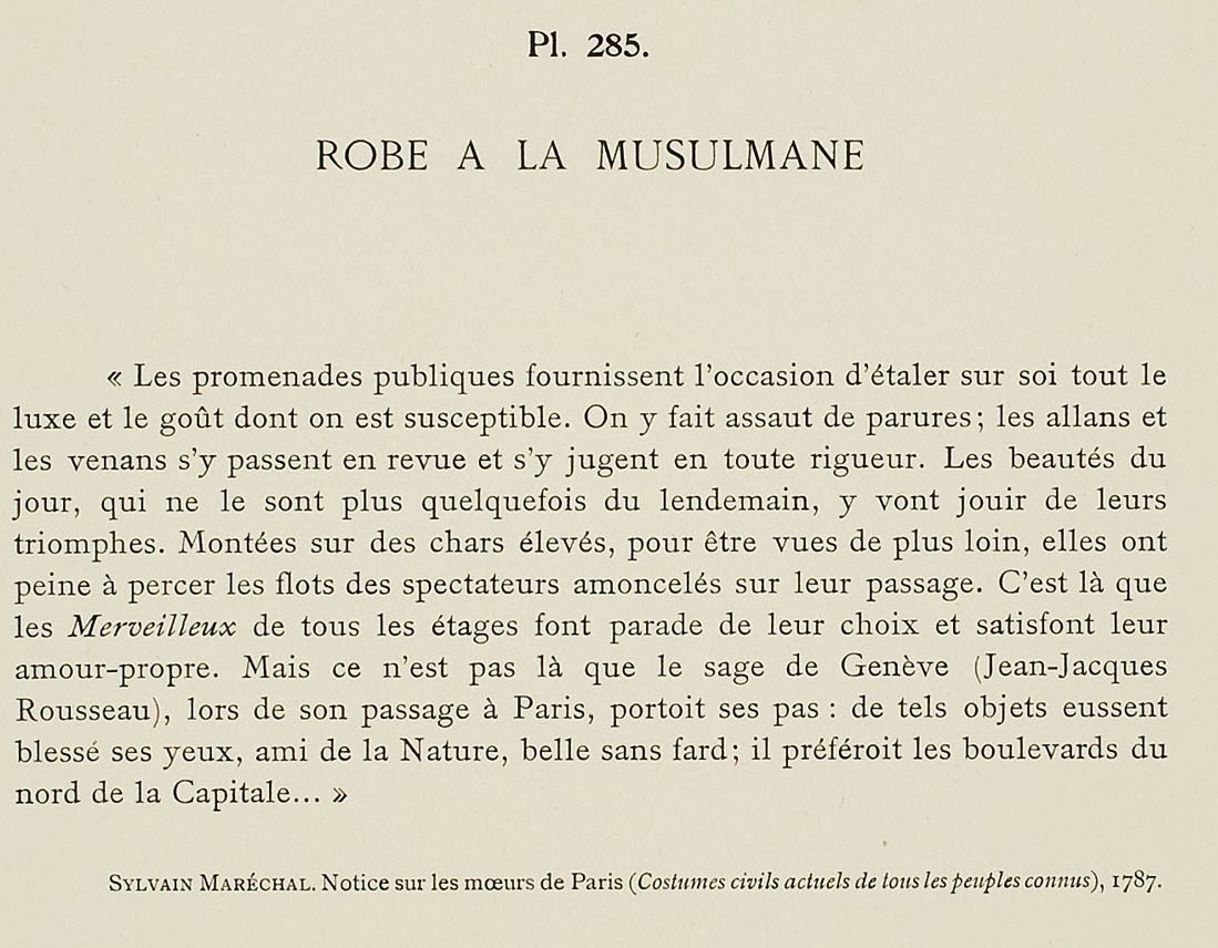 “The public promenades furnish the occasion of displaying on oneself all the luxury and taste to which one is susceptible. There is an assault of parures: the comers and goers pass in review and are judged with all rigor. The beauties of the day, who are sometimes no longer that the next day, go there to enjoy their triumphs. Mounted on their raised chariots, to be seen from far away, they hardly pierce the waves of the piled spectators on their passage. It is there that the Merveilleux of all ages parade their choice and satisfy their pride. But it is not there that the sage of Geneva (Jean-Jacques Rousseau), while on his trip to Paris, bore his steps: such objects had hurt his eyes, friend of Nature, beautiful without rouge; he preferred the boulevards to the north of the Capital …”