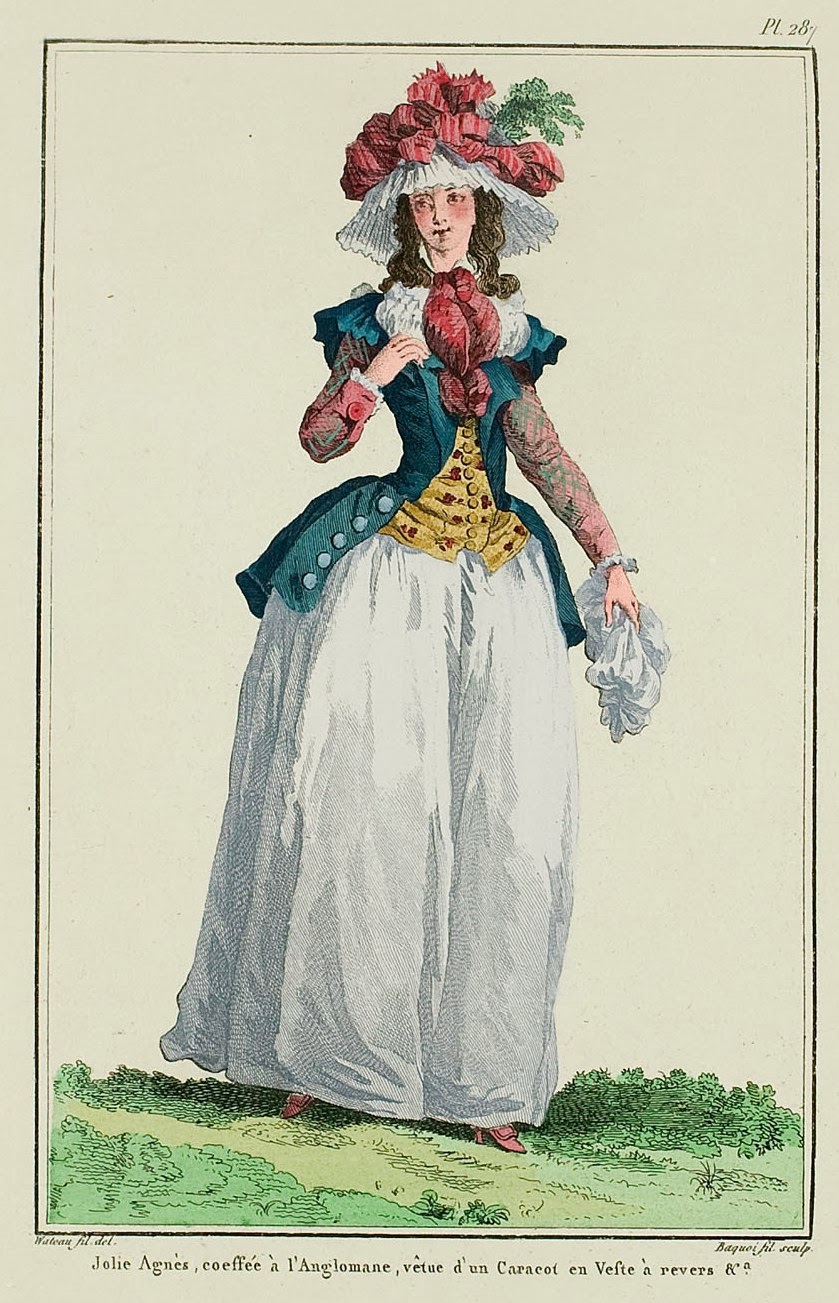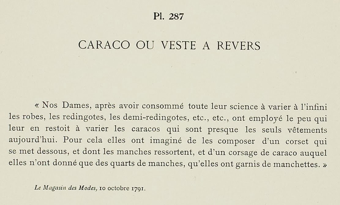 “Our Ladies, after having consumed all their science in infinitely varying their gowns, redingotes, demi-redingotes, etc. etc., have employed the little which remains to them to vary caracos which are nearly the only garments worn today. For that they have begun to compose them of a corset which is worn underneath, and from which the sleeves come out, and a caraco bodice to which they have only given quarter-sleeves, that they trim with manchettes.”