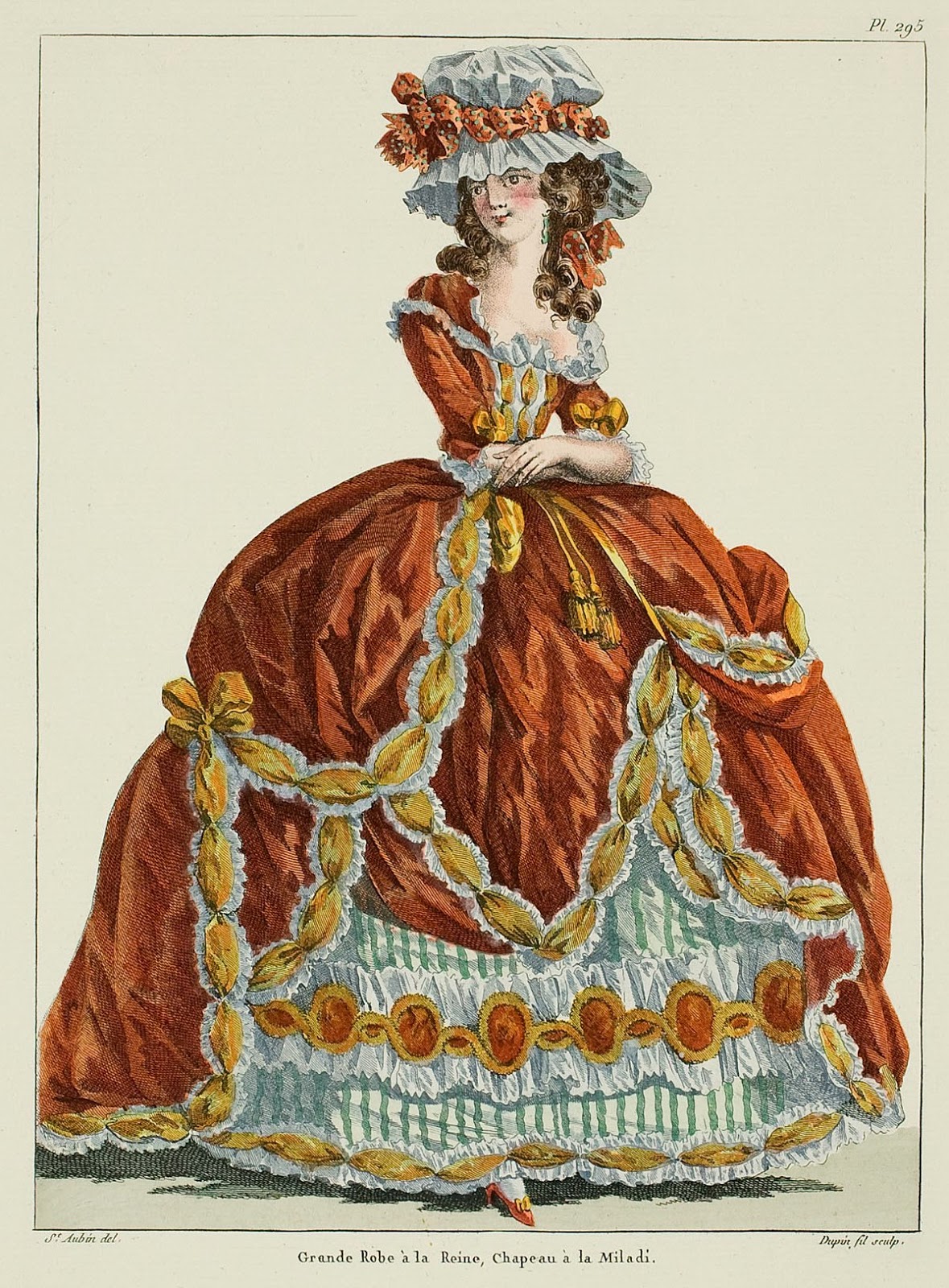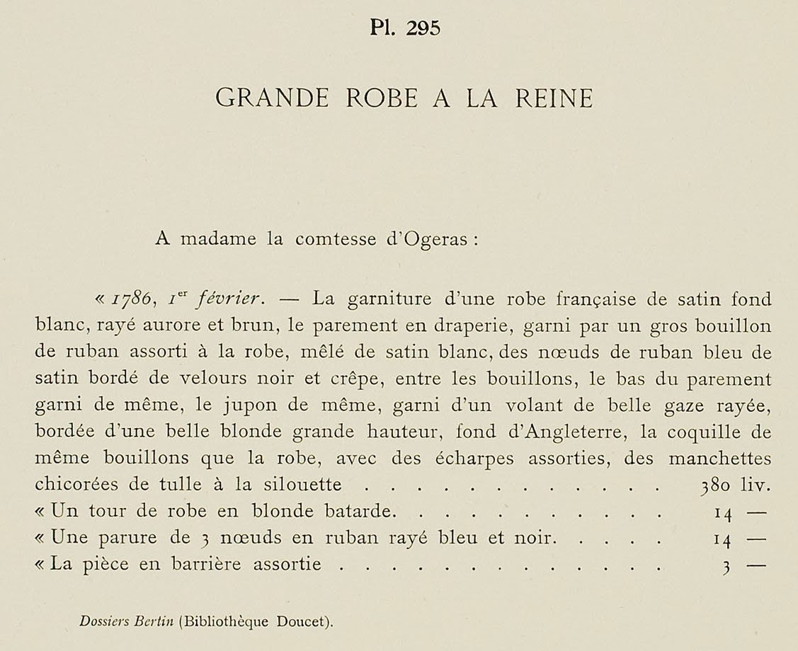 “1786, 1st February. – The trimming of a robe française of satin with a white ground, striped golden yellow and brown, the parement in drapery, trimmed with a large bouillon of ribbon matching the gown, mixed with white satin, bows of blue satin ribbon edged with black velvet and crêpe, between the bouillons, the bottom of the parement trimmed in the same way, the petticoat the same, trimmed with a volant of beautiful striped gauze, edged with a beautiful blonde in fond d’Angleterre with a great height, the coquille* of the same bouillons as the gown, with matching scarves, manchettes with chickory leaves of tulle à la silouette. … 380 livres