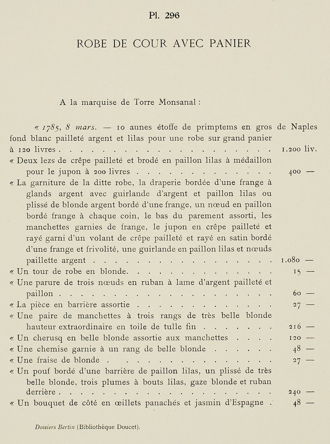 “1785, 8 March. – 10 ells of spring fabric is gros de Naples with a white ground, spangled with silver and lilac for a wide-hooped gown at 120 livres … 1,200 livres.