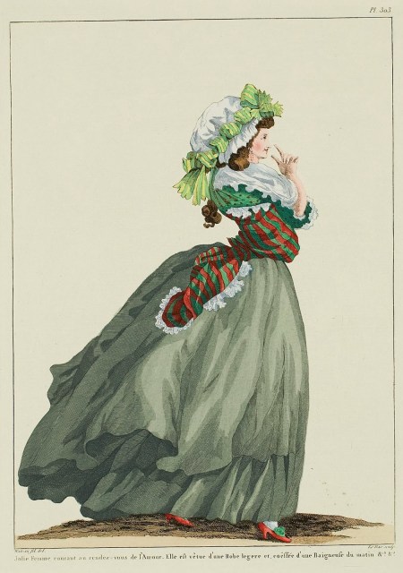 Pretty Woman running to the rendez-vous of Love. She is dressed in a light Gown and coiffed with a morning Baigneuse, etc. etc.