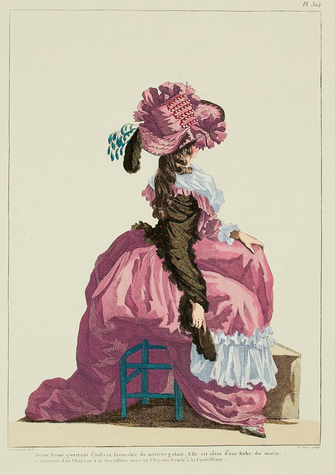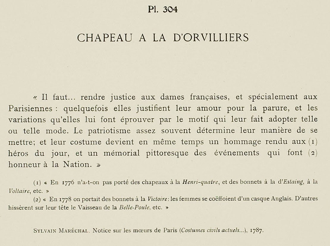(2) “In 1778 caps à la Victoire were worn: women coiffed themselves in English casques. Others hoisted onto their heads the Vessel of the Belle-Poule, etc.”