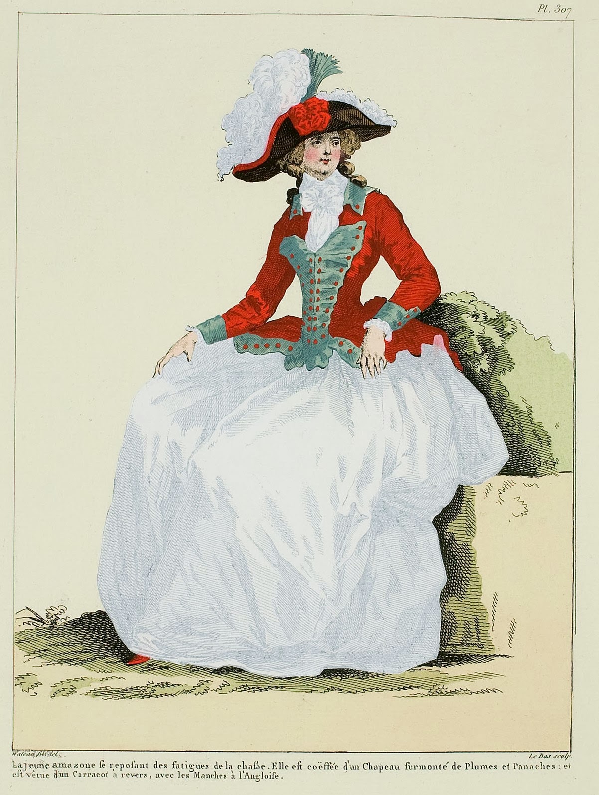 Hmm, wearing a white petticoat of any material around horses just seems like a bad idea! Never mind riding in one. I grew up riding and going to shows and I can tell you things never stayed clean for long. Loving the green and red riding jacket in this print. A period riding habit has been on my sewing list for sooooo long!-EmilyEmily's Vintage Visions