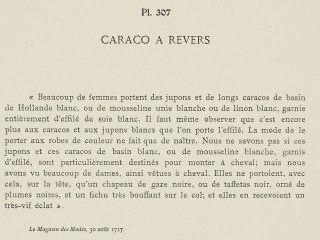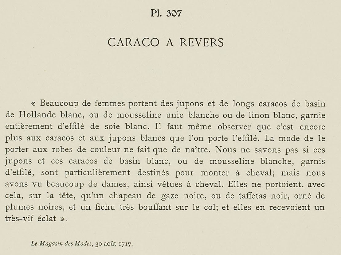 “Many women wear petticoats and long caracos of white Holland basin, or plain white muslin or white linen, trimmed entirely with effilé of white silk.* It is necessary to observe that it is still more frequent for caracos and white petticoats to bear effilé. The fashion of wearing it on colored gowns is only being born. We do not know if these petticoats and caracos of white basin, or white muslin, trimmed with effilé, are particularly intended for riding horses; but we have seen many ladies dressed thus on horseback. They only wear, with this, on their heads, a hat of black gauze, or black taffeta, trimmed with black plumes, and a very puffy kerchief on the neck; and they derive a very-bright éclat from it.”