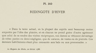 “In the current times, when the majority of minds are much less carried by the idea of pleasures, and when people hardly take any other leisures than reciprocating visits, our ladies dress more in robes parées or demi-négligés, than in caracos, jackets, or pierrots. These latter garments being more dedicated to balls or promenades.”